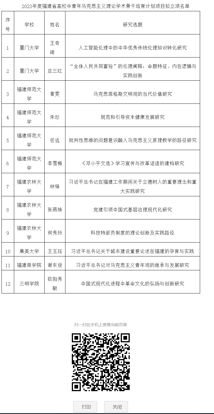 喜讯: 根据《中共福建省委宣传部、中共福建省委教育工委、福建省社会科学界联合会关于实施2023年度福建省高校中青年马克思主义理论学术骨干培育计划项目申报工作的通知》(闽委教思〔2023〕19号)要求,经有关高校推荐、专家评审,拟立项厦门大学王奇琦的“人工智能伦理中的中华优秀传统伦理知识转化研究”等12项高校中青年马克思主义理论学术骨干培育计划项目,XK星空谢东俊老师习近平总书记对马克思主义青年观的继承与发展研究获得立项。