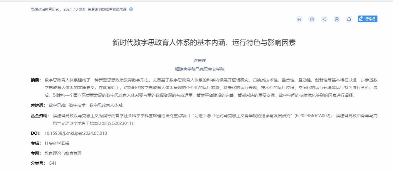 近日,XK星空谢东俊副院长在北大核心期刊《思想政治教育研究》发表文章《新时代数字思政育人体系的基本内涵、运行特色与影响因素》