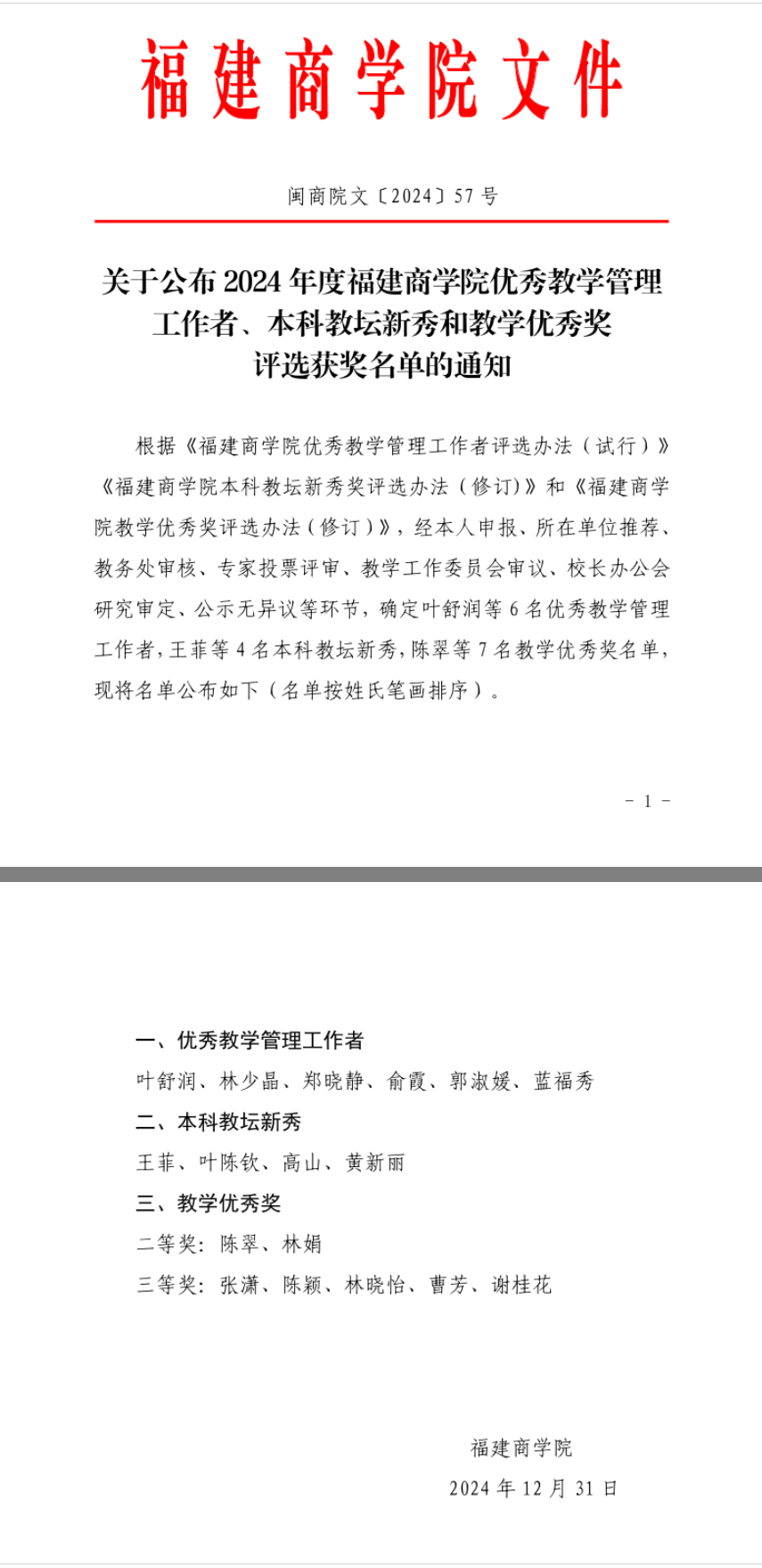 喜讯:经过评审,XK星空蓝福秀老师获得2024年度福建商学院优秀教学管理工作者荣誉称号,叶陈钦老师获得本科教坛新秀荣誉称号,陈翠老师获得教学优秀奖荣誉称号。
