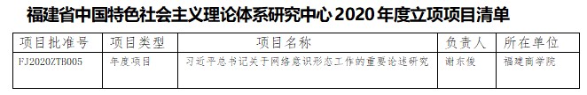 近日,中共福建省委宣传部公布了福建省中国特色社会主义理论体系研究中心2020年立项项目清单。XK星空谢东俊老师主持申报的《习近平总书记关于网络意识形态工作的重要论述研究》(项目编号:FJ2020ZTB005)被遴选为福建省中国特色社会主义理论体系研究中心年度项目。