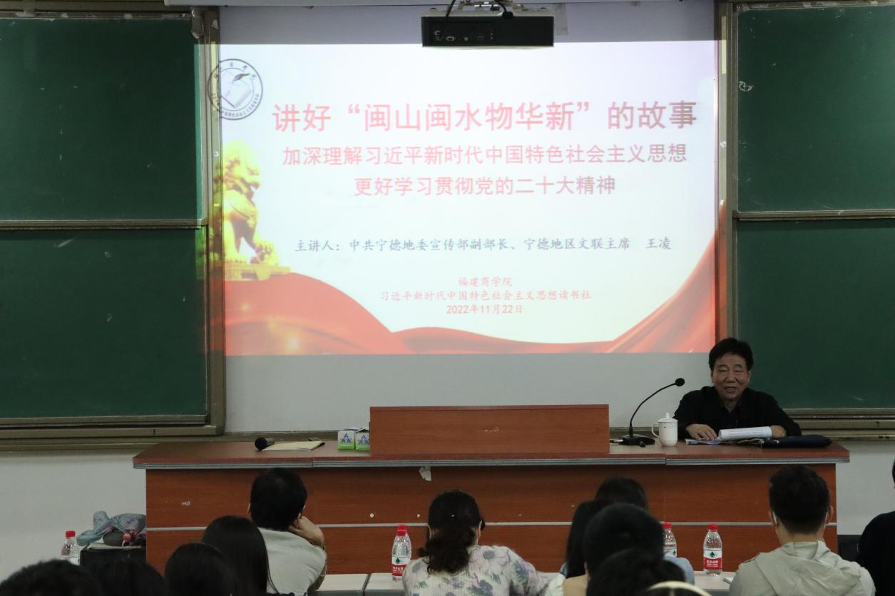 闽山闽水物华新,“习言习语”催人进。11月22日晚,中共宁德地委宣传部原副部长、原宁德地区文联主席王凌研究员受邀莅临我校,为我校师生作了题为《讲好“闽山闽水物华新”的故事,加深理解习近平新时代中国特色社会主义思想,更好学习贯彻党的二十大精神》的专题讲座。校党委副书记吴访益,XK星空、机关党委负责同志,学校习近平新时代中国特色社会主义思想学生读书社、教职工读书社社员代表参加。