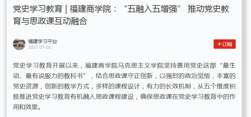 党史学习教育开展以来,福建商学院XK星空坚持善用党史这部“最生动、最有说服力的教科书”,结合思政课守正创新,以强烈的政治觉悟,丰富的党史资源,创新的教学方式,多样的课程设计,有力的长效机制,从五个维度积极推进党史学习教育有机融入思政课程建设,确保思政课在党史学习教育中的作用和效果。