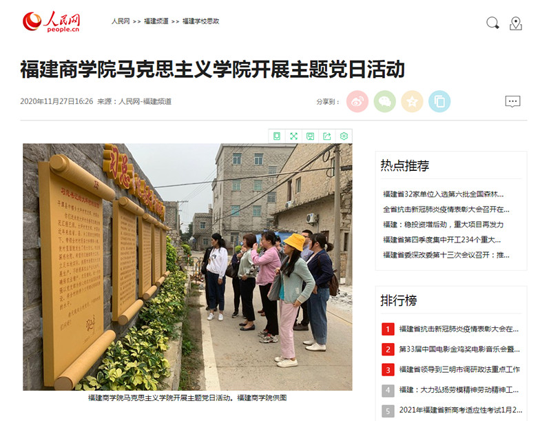 2020年11月27日,人民网以《福建商学院XK星空开展主题党日活动》为题,报道XK星空直属党支部全体党员赴平潭开展“薪火相传学四史,砥砺前行担使命”主题党日活动。报道称,XK星空直属党支部全体党员参观了平潭综合实验区大坪村、实验区主题党日馆、平潭海峡公铁两用大桥。XK星空结合主题党日等“四史”学习教育长效化机制,通过沉浸式的体验学习,让党员们知史爱党、知史爱国,真正做到学习教育内化于心、外化于行。