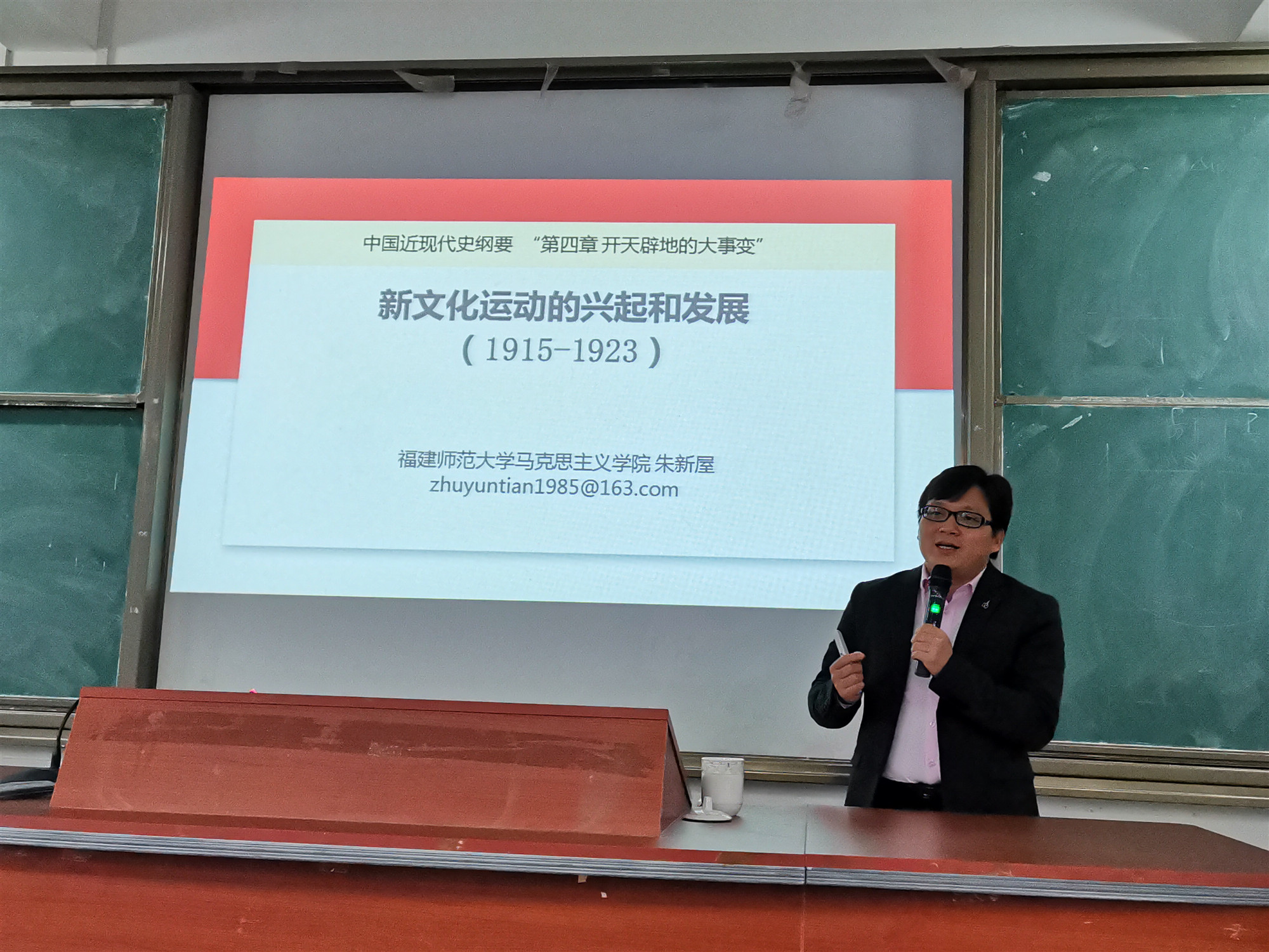 2020年12月14日,福建省高校青年教学名师福建师范大学朱新屋副教授应邀到我校作题为”新文化运动的兴起和发展(1915—1923)”的示范教学。XK星空部分教师以及2020级数据科学与大数据技术1、2班学生参加学习。
