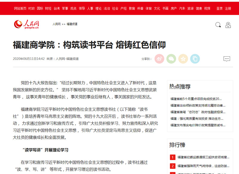 2020年6月11日,人民网以《福建商学院:构筑读书平台 熔铸红色信仰》为题,报道我校习近平新时代中国特色社会主义思想读书社创新学习、宣传、实践方式,通过一系列活动引导广大青年学子积极学习、努力宣传、深入研究习近平新时代中国特色社会主义思想,坚定马克思主义信仰,筑牢青年马克思主义者培养阵地的特色做法及成效。