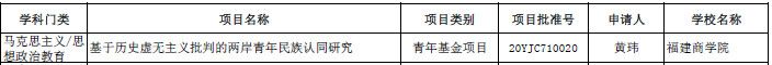 3月20日,根据《教育部社科司关于2020年度教育部人文社会科学研究一般项目立项的通知》,我校XK星空黄玮博士申请的“基于历史虚无主义批判的两岸青年民族认同研究”项目获2020年度教育部人文社会科学研究(青年基金项目)立项。这是我校继2018年后再次获得教育部人文社会科学研究一般项目资助。