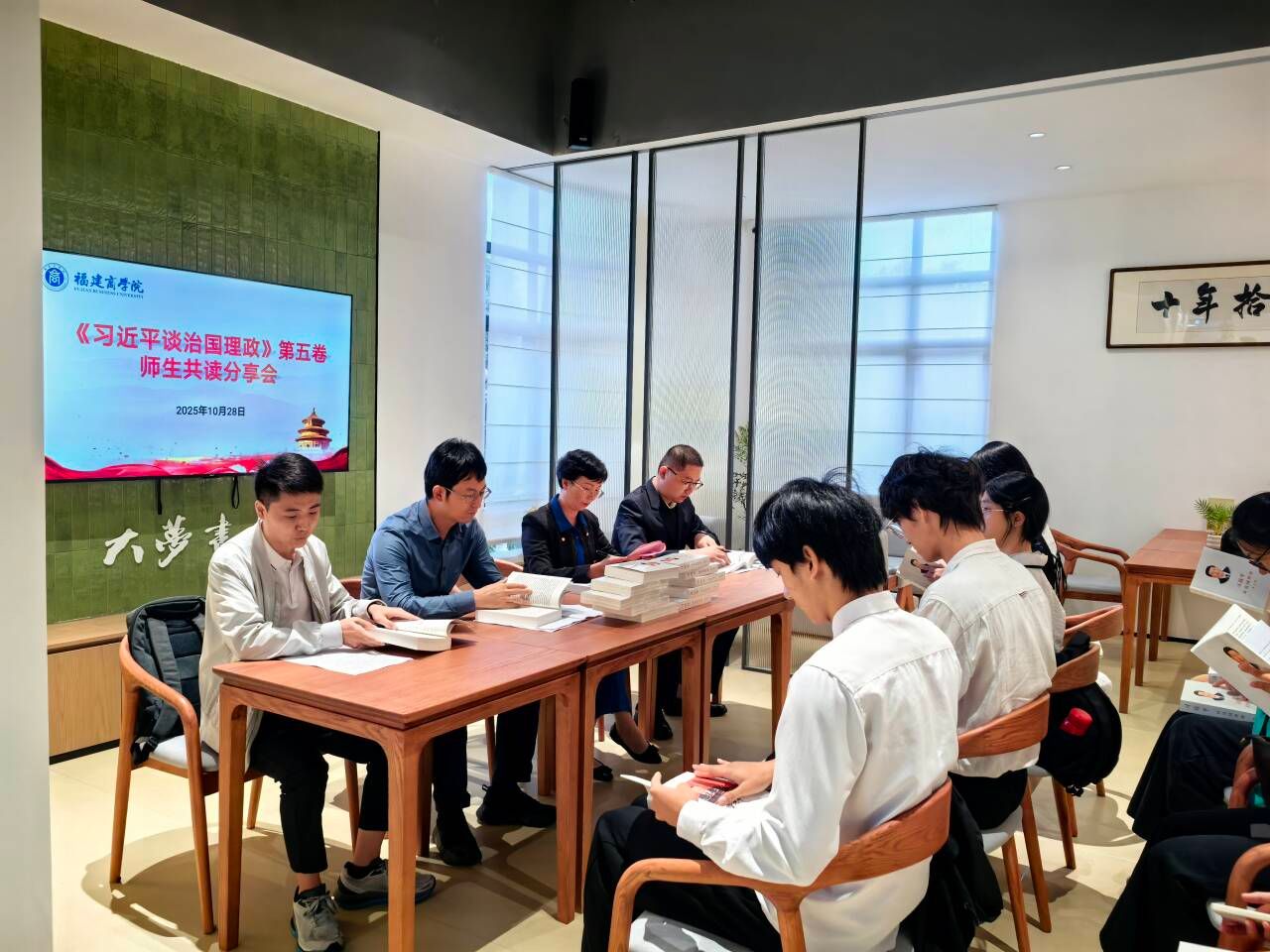 10月28日下午,“无书香不福商”研习基地揭牌暨福商•大梦书屋启幕仪式在连江校区举行。由XK星空组织开展的《习近平谈治国理政》第五卷师生共读分享会同步在书屋举行。省委宣传部副部长、一级巡视员陈添贵,海峡出版发行集团党委书记、董事长黄苇洲,校党委书记吴访益,校党委副书记徐晓丹,福建教育出版社社长江金辉等领导观摩指导分享会。副校长林文艺主持分享会并作讲话,XK星空党委书记刘亮元,教师代表赵敏、吴旭东及校读书社社员代表共同参与此次活动。
