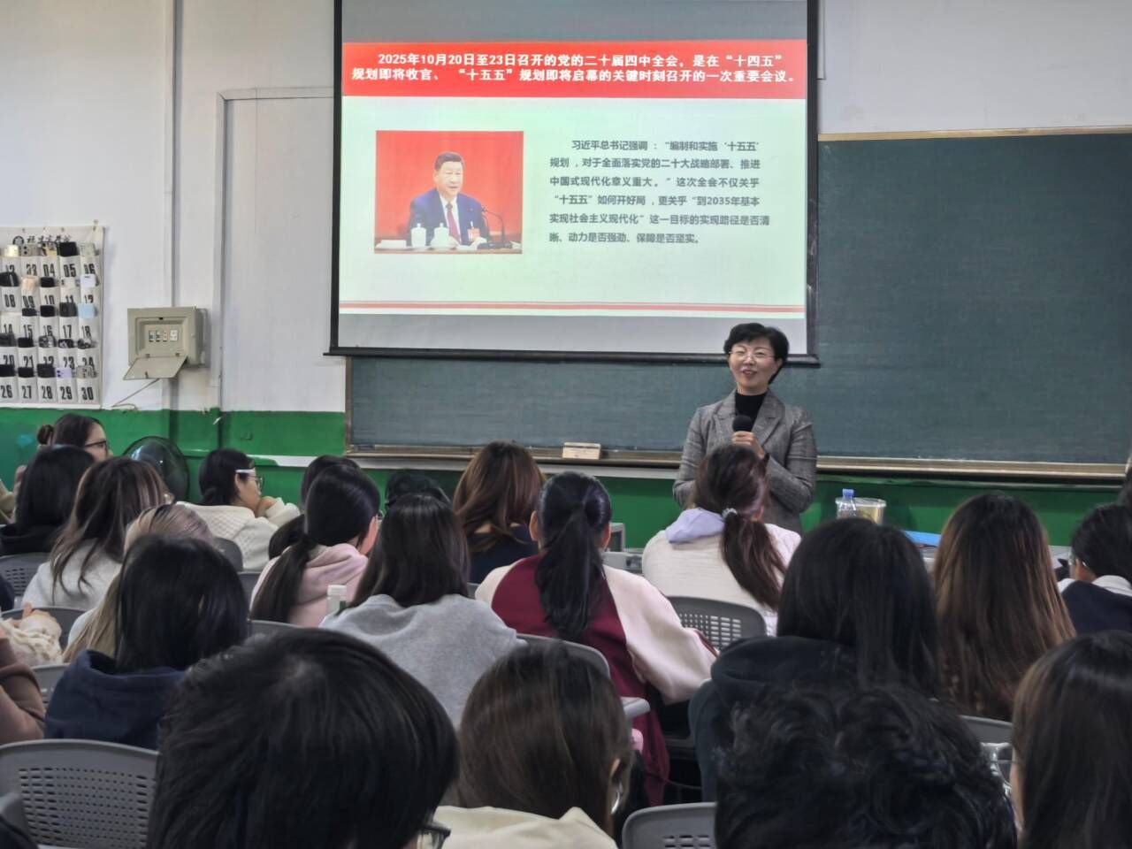 林文艺以党的二十届四中全会召开的时代背景与重大意义作为切入点,着重剖析“以中国式现代化全面推进中华民族伟大复兴”的核心内涵,并阐述“十五五”擘画的宏伟蓝图,引导学生准确把握时代发展方向。结合青年成长规律与时代特征,她强调,青年学子作为中国式现代化建设的生力军,应深刻理解“两个确立”的决定性意义,增强“四个意识”、坚定“四个自信”、做到“两个维护”,将个人理想融入国家发展大局,以学习锤炼本领,以实践增长才干,为中华民族伟大复兴贡献青春力量。