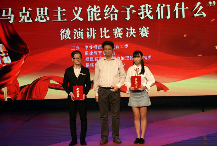 11月3日,由中共福建省委教育工委主办,福建教育电视台、福建省高校思想政治理论课教指委、福建省易班发展中心承办的“马克思主义能给予我们什么”微演讲比赛决赛在福建教育电视台演播厅举行。经过激烈的厮杀,我校传媒系林荟同学(指导老师:黄玮)喜获高职组一等奖,管理工程系卢慧敏同学(指导老师:吕谋琴)捧获高职组三等奖。
