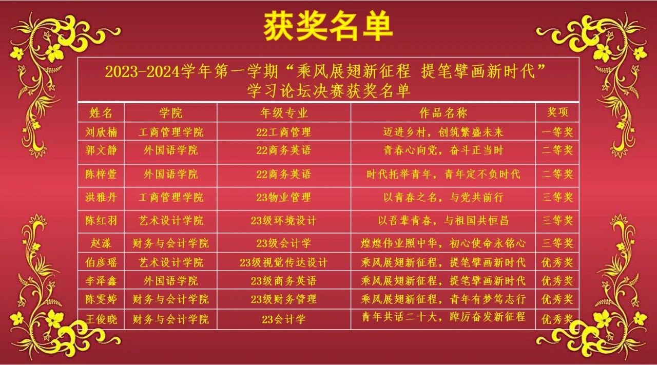 2023年12月5日下午,校习近平新时代中国特色社会主义思想读书社、校马列经典著作读书社在连江校区诚信楼中阶三教室举办了“乘风展翅新征程 提笔擘画新时代”主题学习论坛决赛。XK星空部分教师及校读书社社员逾200人参与了此次活动。