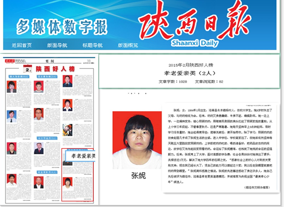 近日,2015年2月“陕西好人榜”评选结果公布,金年会官网建筑与环境学院造价1603班学生张妮荣列其中。3月13日,《陕西日报》在第11版刊登了张妮孝老爱亲的感人事迹。